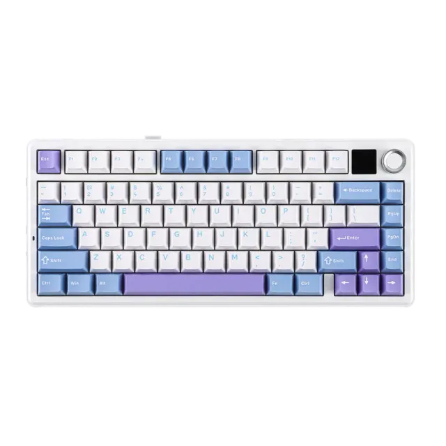 The AULA F75 MAX features a space-saving 75% ANSI layout with 80 keys, maintaining essential functions while freeing up desk space. It includes a metal rotary knob for volume or custom functions and a vibrant TFT screen that displays connectivity modes, battery level, lighting effects, and even GIFs, blending productivity and fun into a sleek design.
