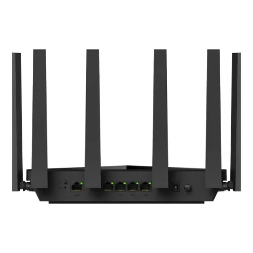 The Cudy WR6500 BE6500 Dual Band Gigabit WiFi 7 Router is a powerful networking solution. This Cudy WiFi 7 router, powered by a Broadcom BCM6766 chipset and a 2.0 GHz quad-core ARM Cortex-A7 processor, delivers smooth performance even during peak network traffic. It has 512MB DDR4 RAM and 128MB NAND flash storage, providing the power and reliability required for smooth streaming, gaming, and smart home integration. The Cudy WR6500 Dual Band Router provides blazing-fast Wi-Fi 7 speeds, with up to 5765 Mbps on the 5 GHz band and 688 Mbps on the 2.4 GHz band. With 4×4 MIMO for 5 GHz and 2×2 MIMO for 2.4 GHz, it provides robust and consistent signal coverage. The six fixed external antennas have a maximum gain of 5.27 dBi at 5 GHz and 5.19 dBi at 2.4 GHz, which improves range and dependability. The Cudy WR6500 BE6500 Dual Band Gigabit Router, equipped with beamforming technology and sophisticated FEM/PA/LNA amplifiers, can cover up to 240 meters of open space and efficiently penetrate walls, making it perfect for multi-room configurations. Designed to accommodate up to 200 connected devices, the WR6500 is ideal for households with several users, IoT devices, and high-bandwidth activities. It has five gigabit Ethernet ports, including one WAN and four LAN ports, to ensure reliable wired connectivity for gaming consoles, PCs, and smart TVs. The Cudy WR6500 BE6500 Dual Band Gigabit WiFi 7 Router also has a power on/off button, a WPS button, and a reset button for convenient management.